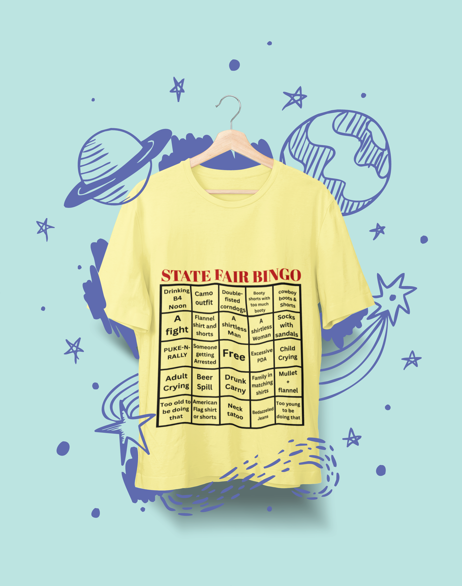 Add some laughs to your next outing with this hilarious State Fair Bingo t-shirt! Designed for those who love people-watching and making memories at state fairs, this tee features a playful bingo card full of classic fairground characters and moments. Whether you're day-drinking, rocking cowboy boots, or just enjoying the chaos, this shirt has a square for it!